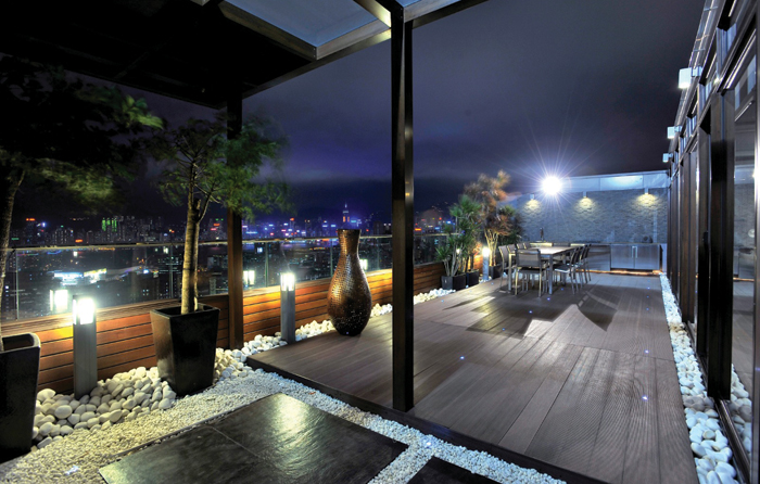 The highlight of tri-levelled flat, however, can be aptly found a little higher up in the form of a top floor that boast a dedicated relaxation zone, personal fitness room and discreet access to the external Zen-like sky garden, with its stunning views across the surrounding landscape, complete with pebbled grounds that encase the wooden floor panelling of the alfresco roof space, a steel-kitchen-and-sink unit lies handily nestled against one side of the wall. All in all, this upper deck serves as the perfect perch for a relaxing outdoor feast with either a multitude of acquaintances or a more intimate affair with just family and loved ones.