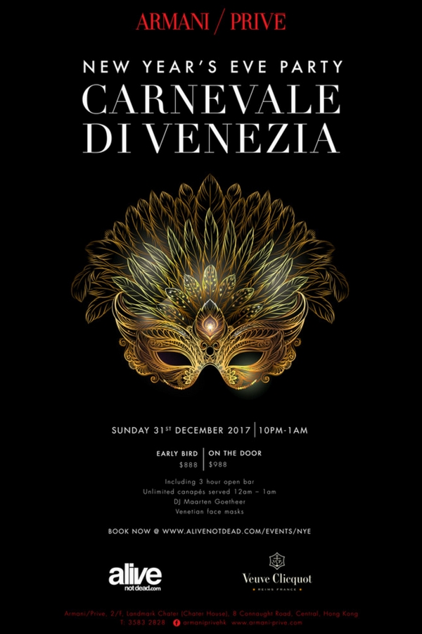 Armani/Privé, Central’s most stylish roof terrace, presents a Venetian masquerade party on New Year’s Eve from 10pm to 1am. Titled Carnevale di Venezia, it invites guests to embrace the mystique spirit of Venice with live dancers and exhilarating music by DJ Maarten Goetheer. Early-bird tickets are priced at HK$888 and include a three-hour long access to an open bar. Entry tickets purchased after 25 December will priced at HK$988.